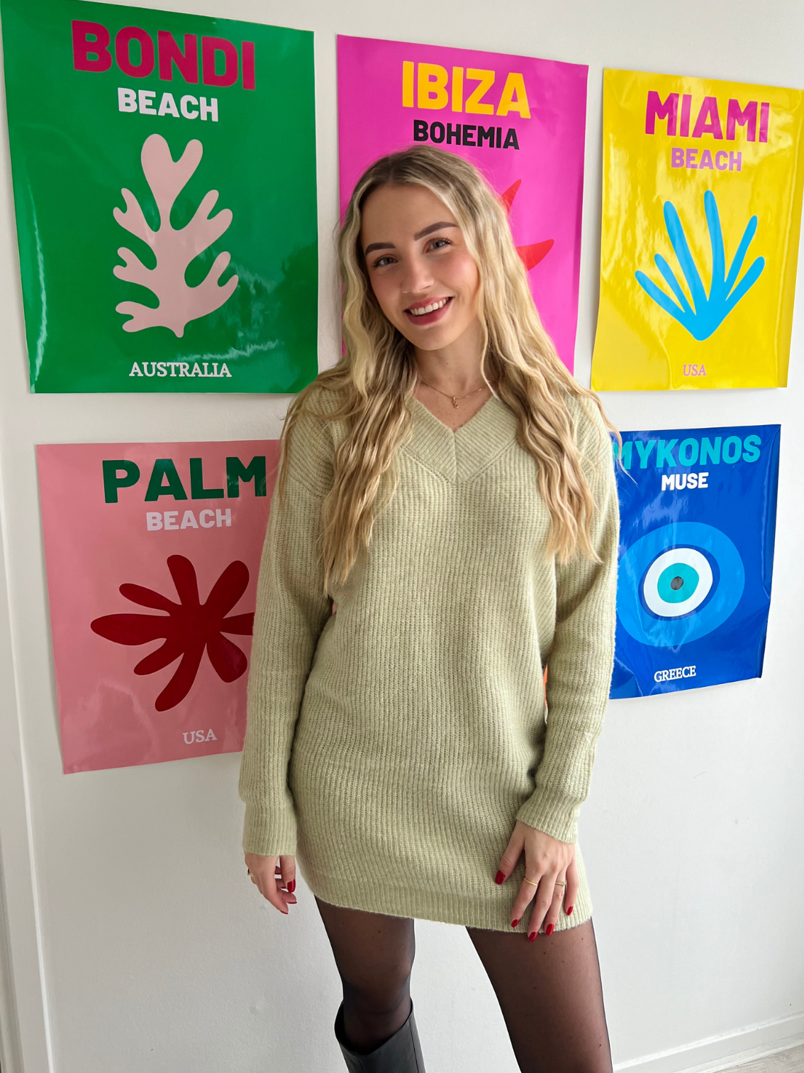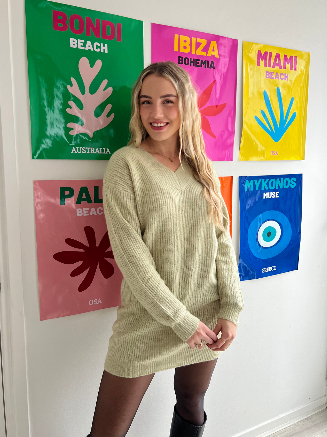 Oversized gebreide trui jurk in een lichte kleur groen. Het jurkje heeft een goede lengte en valt niet te kort.