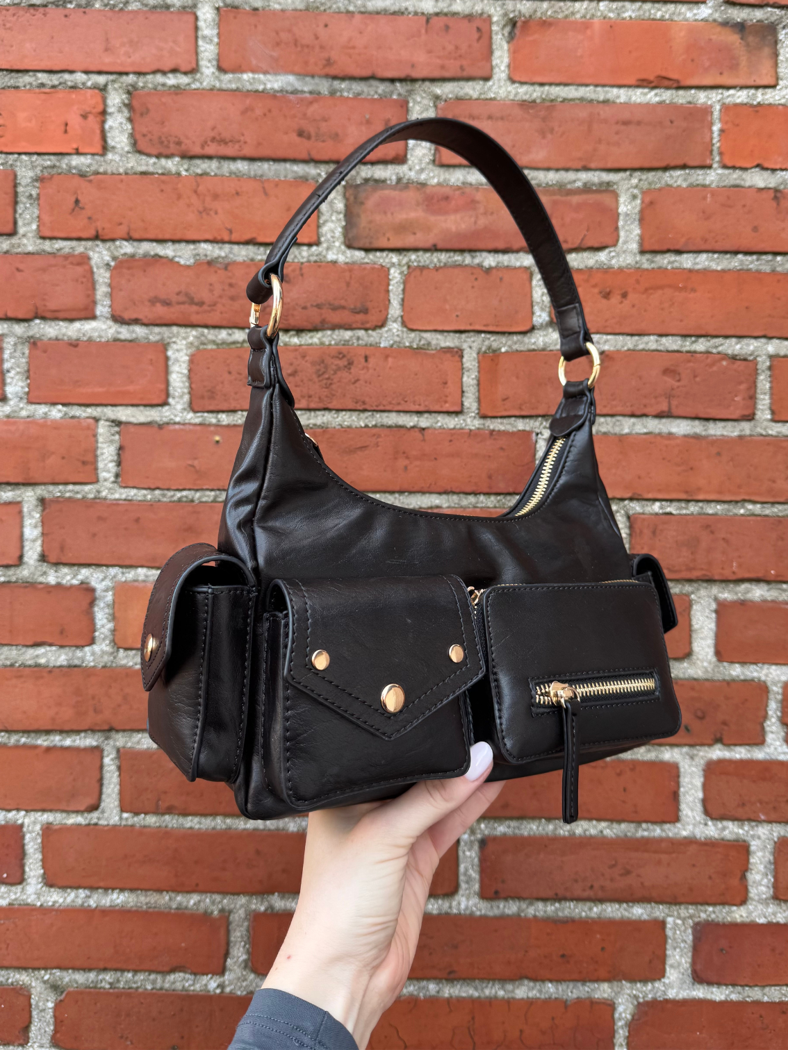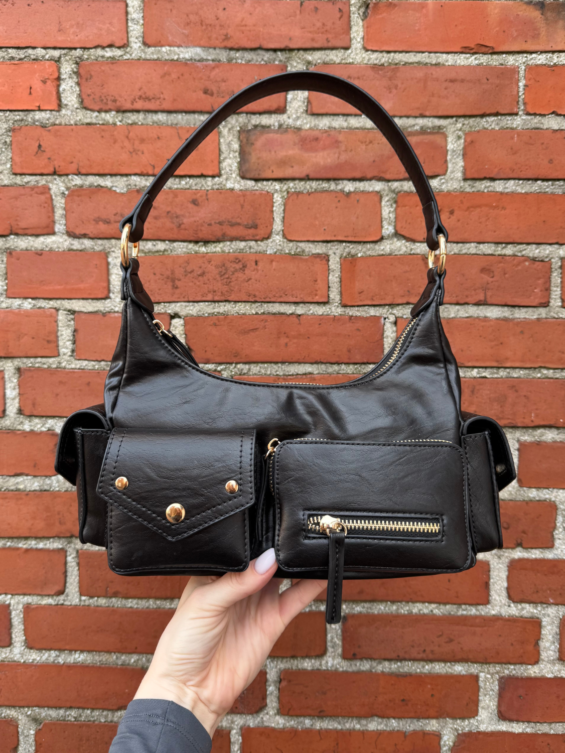 Kunstlederen handtas met meerdere vakjes en goudkleurige details. Inclusief een langere schouderband.