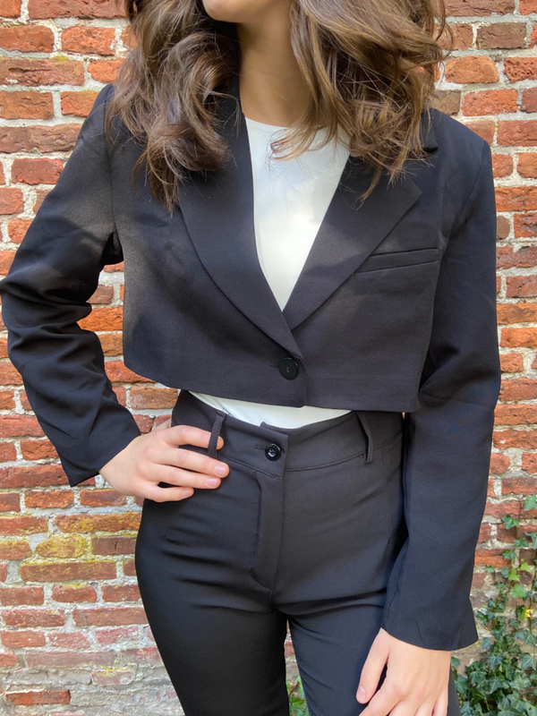 Cropped blazer met schoudervulling. Op de mouwen zitten meerdere knopen.